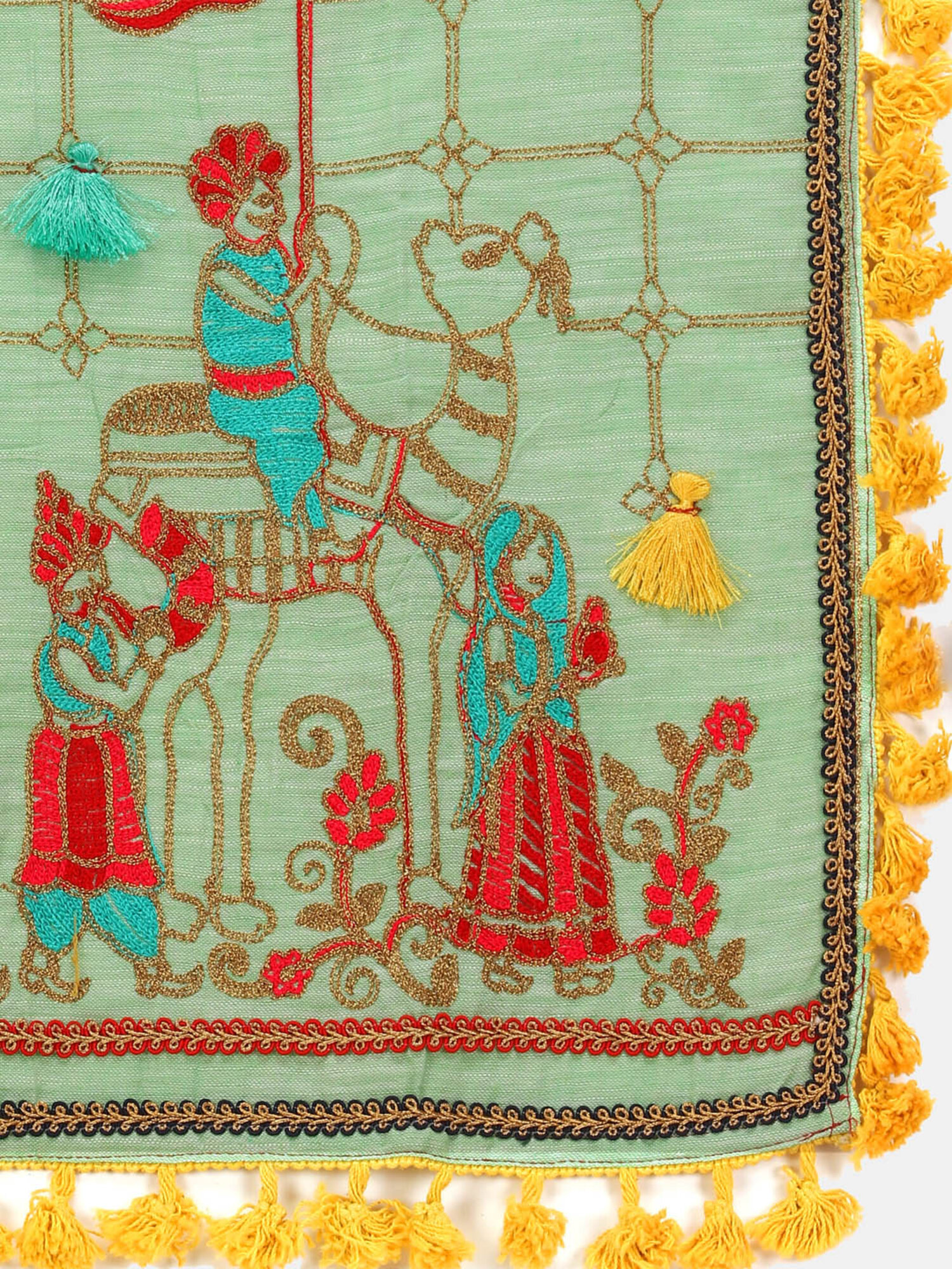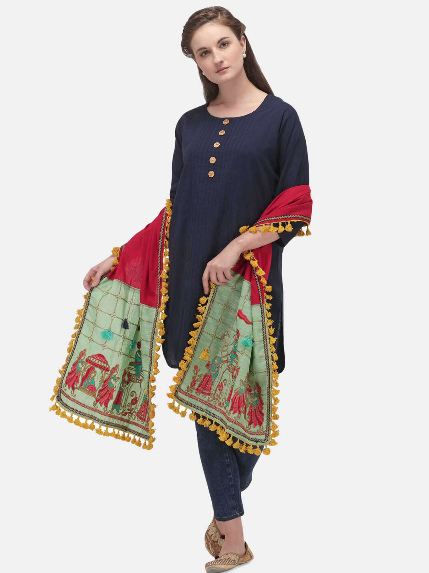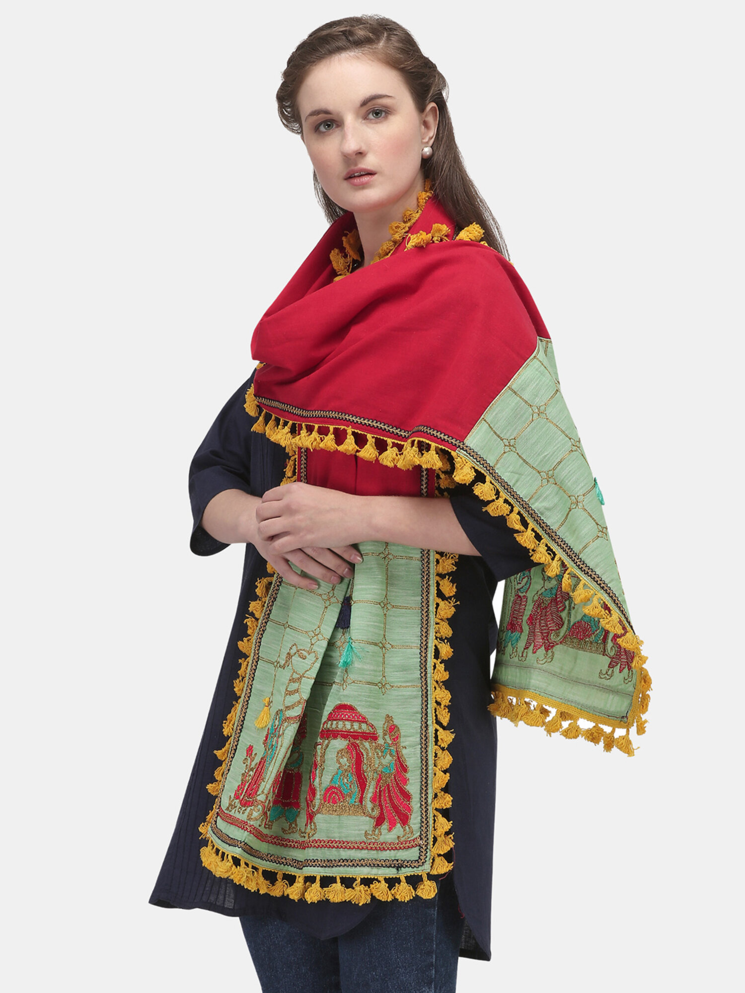 This red and parrot dupatta is crafted in organic khadi cotton. It is embroidered with minute aari work in rath foke motif. This dupatta is attached with panels on both the sides. It is embellished with fancy laces and dyed tassel laces. hand made tassels are tucked on th panel. This colorful dupatta is perfect for your festive occassion.