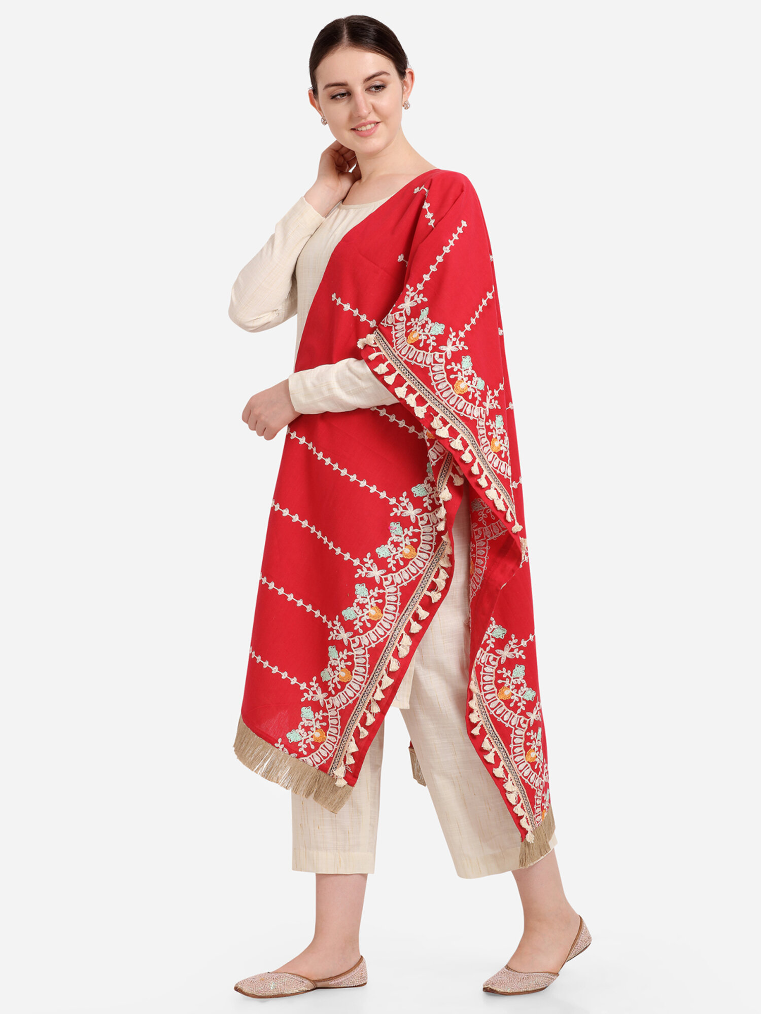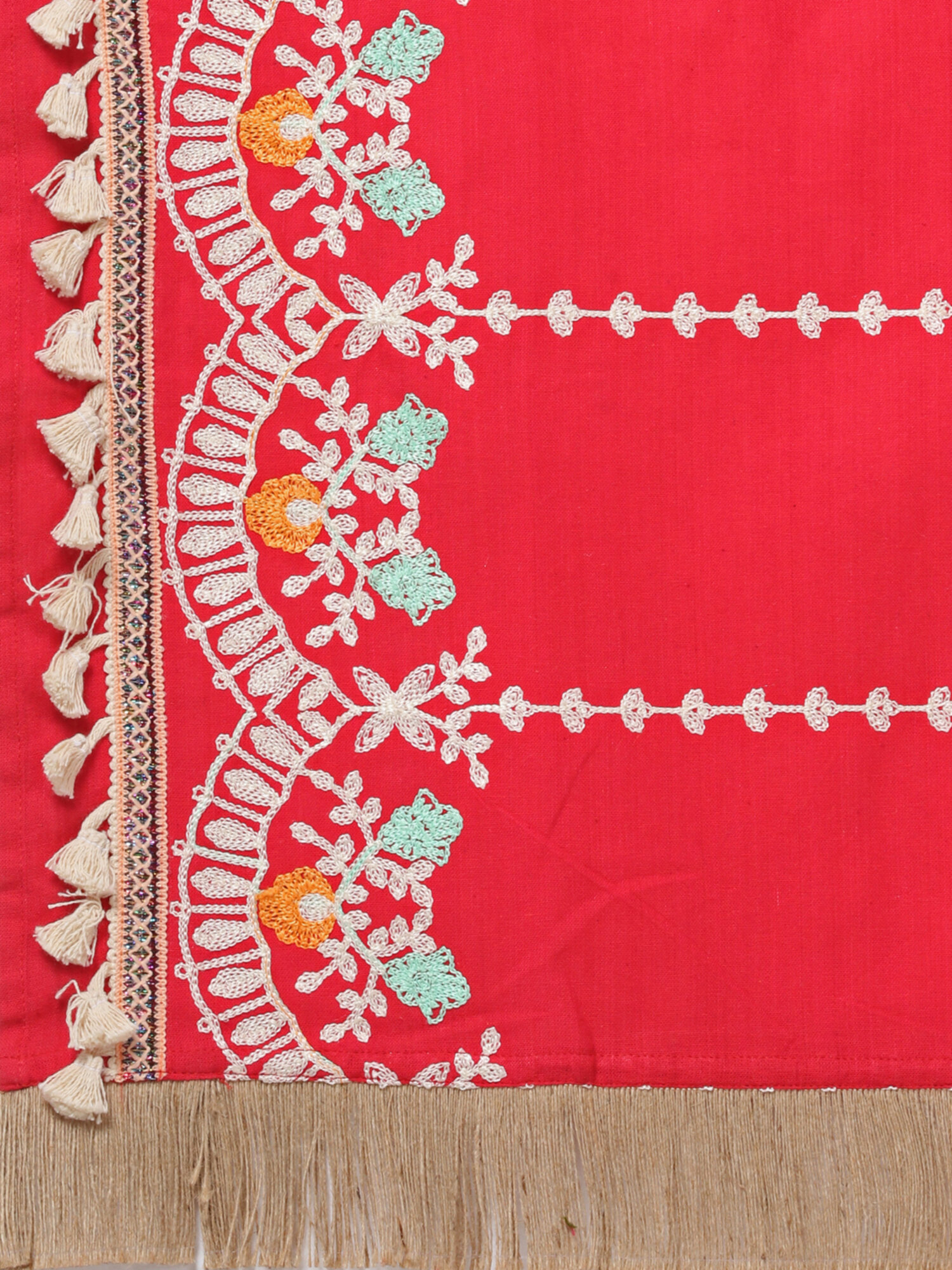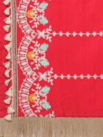 Red Floral Embroidered Stole With Cotton Tassels Lace