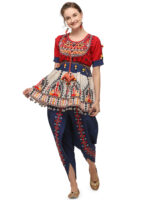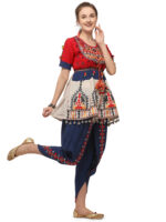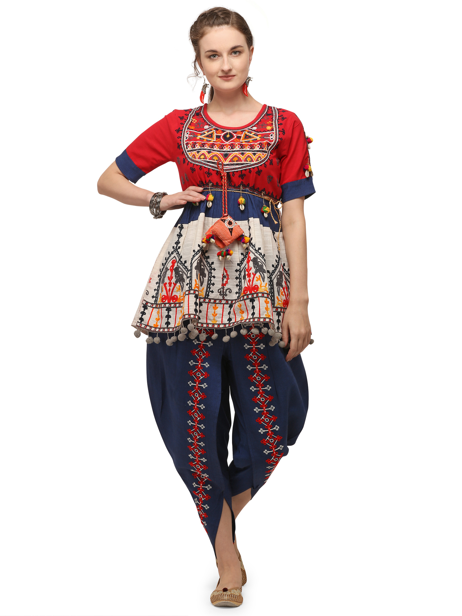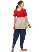 This red and white kedia is crafted in organic khadi cotton. It is embroidered with minute aari work in different foke motifs. It has a maharani yoke with round neck line and 10″ sleeves. The flair has a navyblue portion attached with white flair. It is embellished with fancy laces and dyed pom pom laces. Hand made potli latkans are attached with fancy string on yoke. This kedia is paired with navy blue tulip pant embroidered with two color border in front. The gorgeous outfit is perfect for navratri festival and other festive occassions.