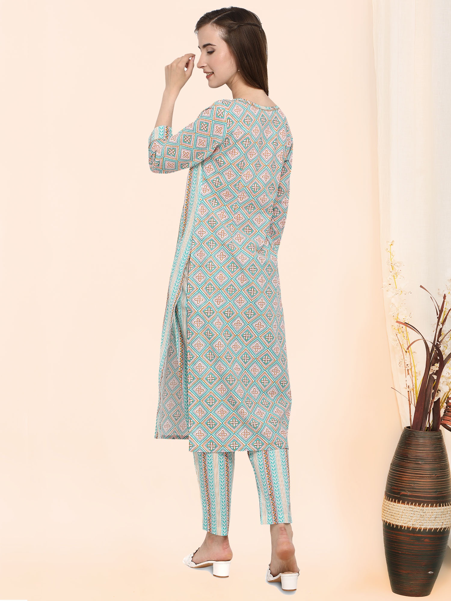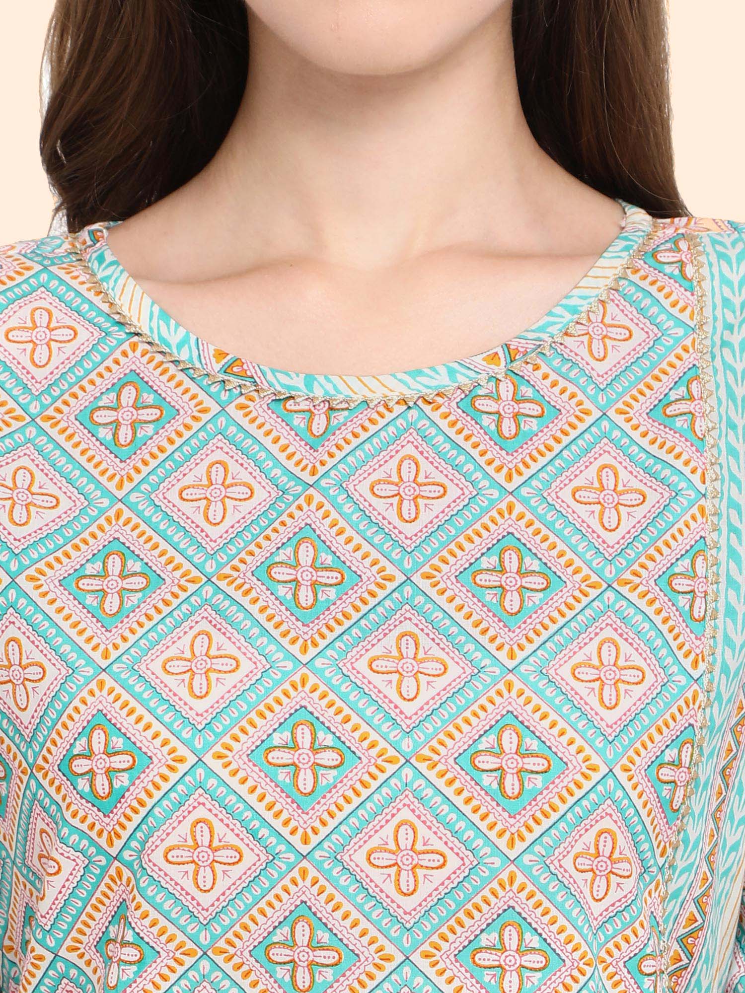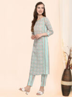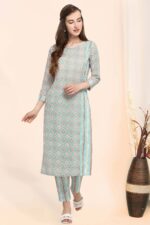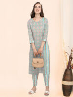 Sea blue soft organic cotton kurti with floral print . It has 3/4 sleeves paired with narrow pant . The pant has all over elastic at the waist .