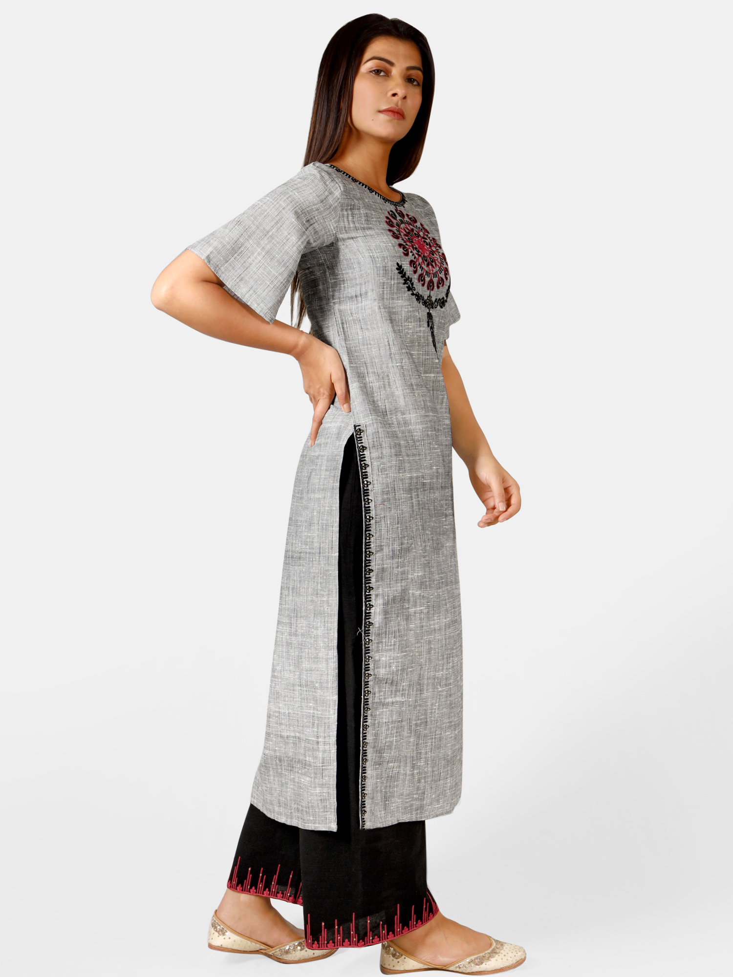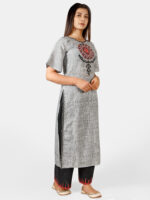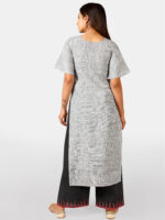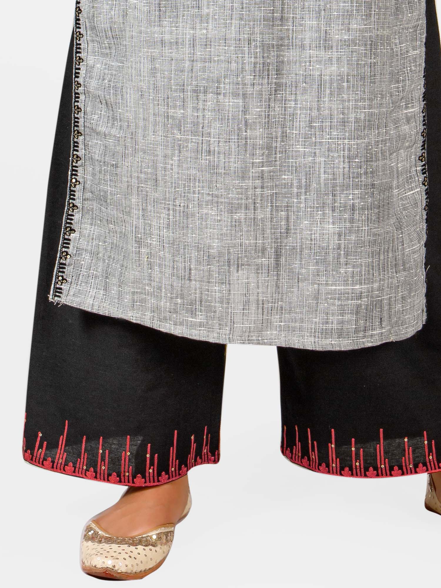 Silver slub embroidered neck kurta with black plazzo pant