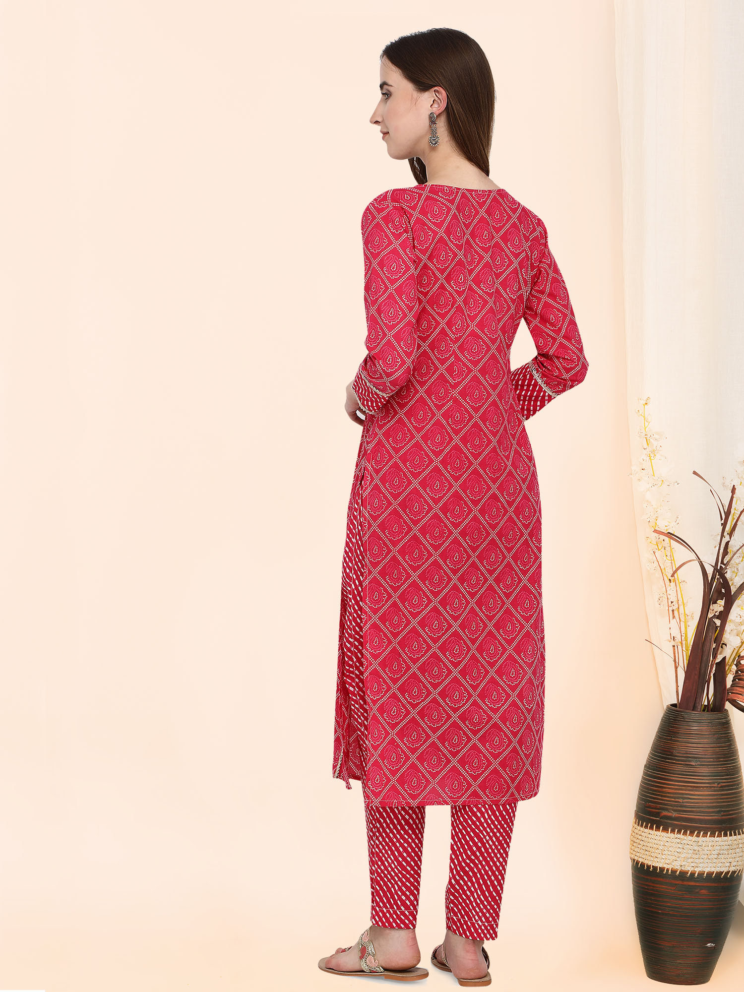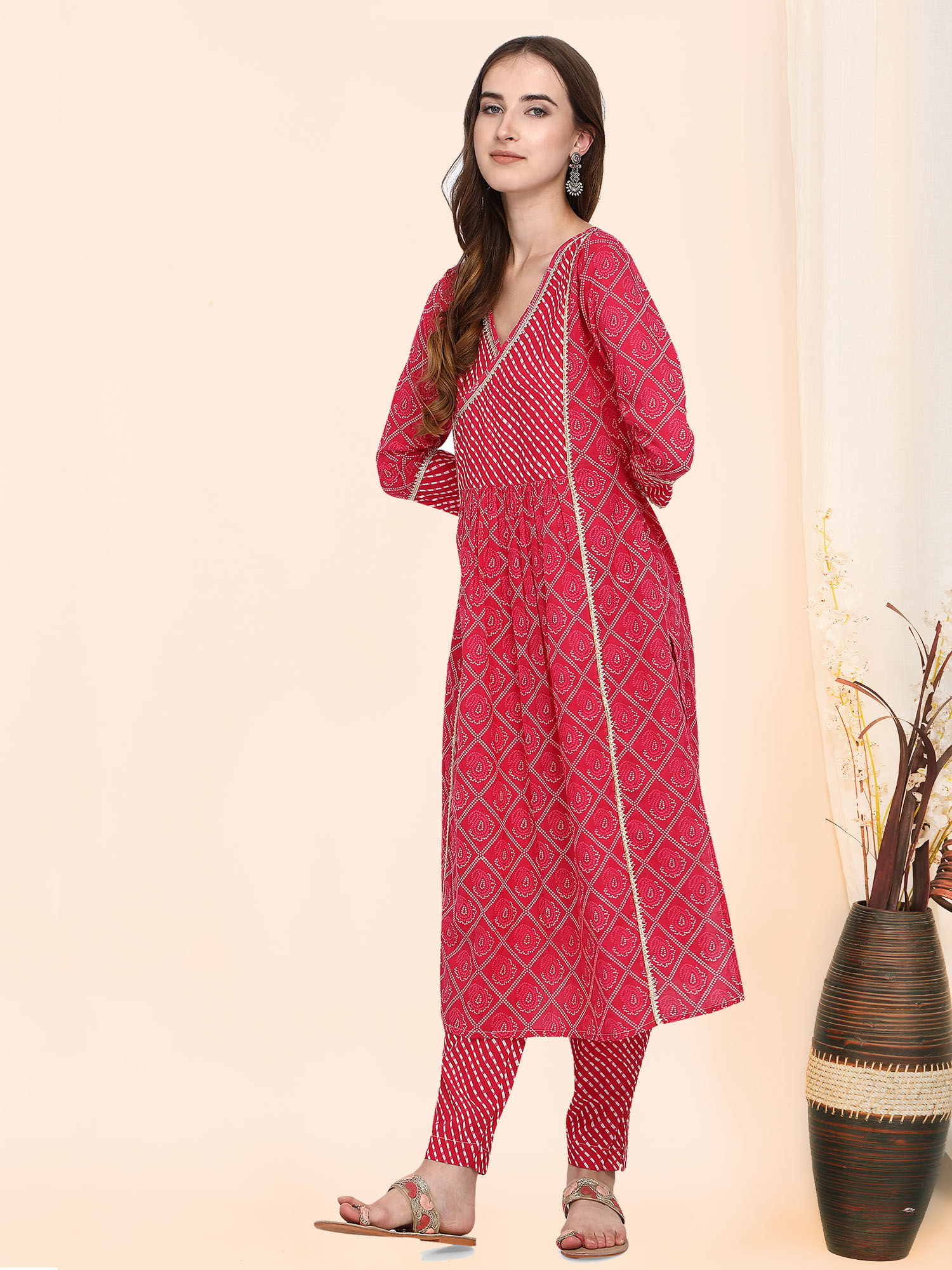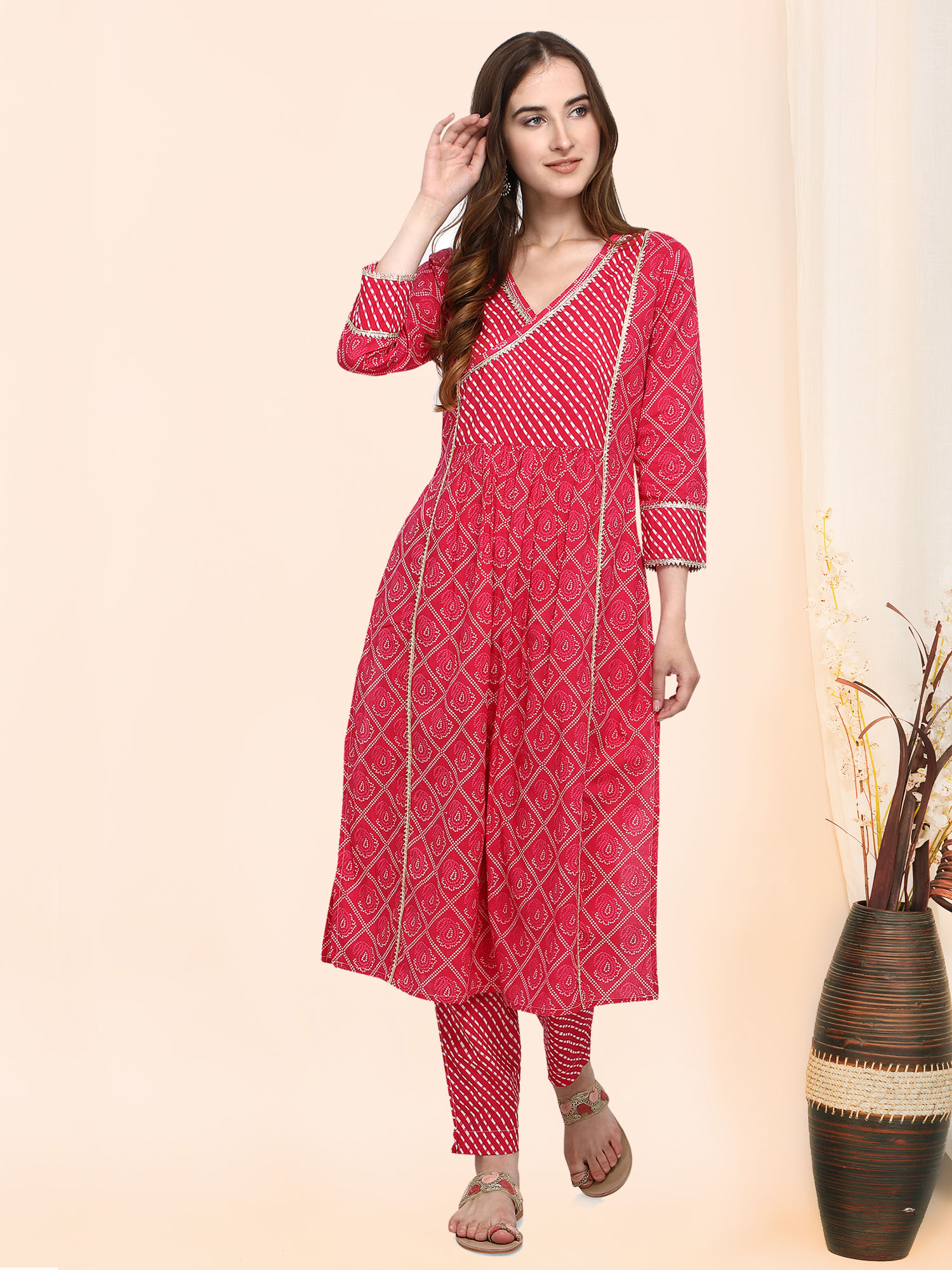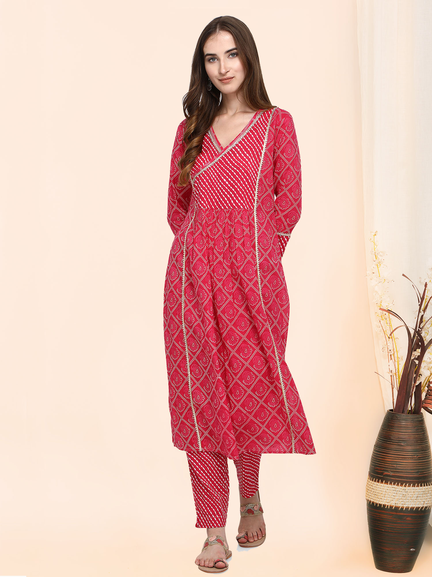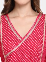 Festive pink bandhani printed kurta has a beautiful v-neck patched with leheriya print and fenced with Gota Lace. Pants are narrow and leheriya printed. This dress is perfect for your festive ocassions.