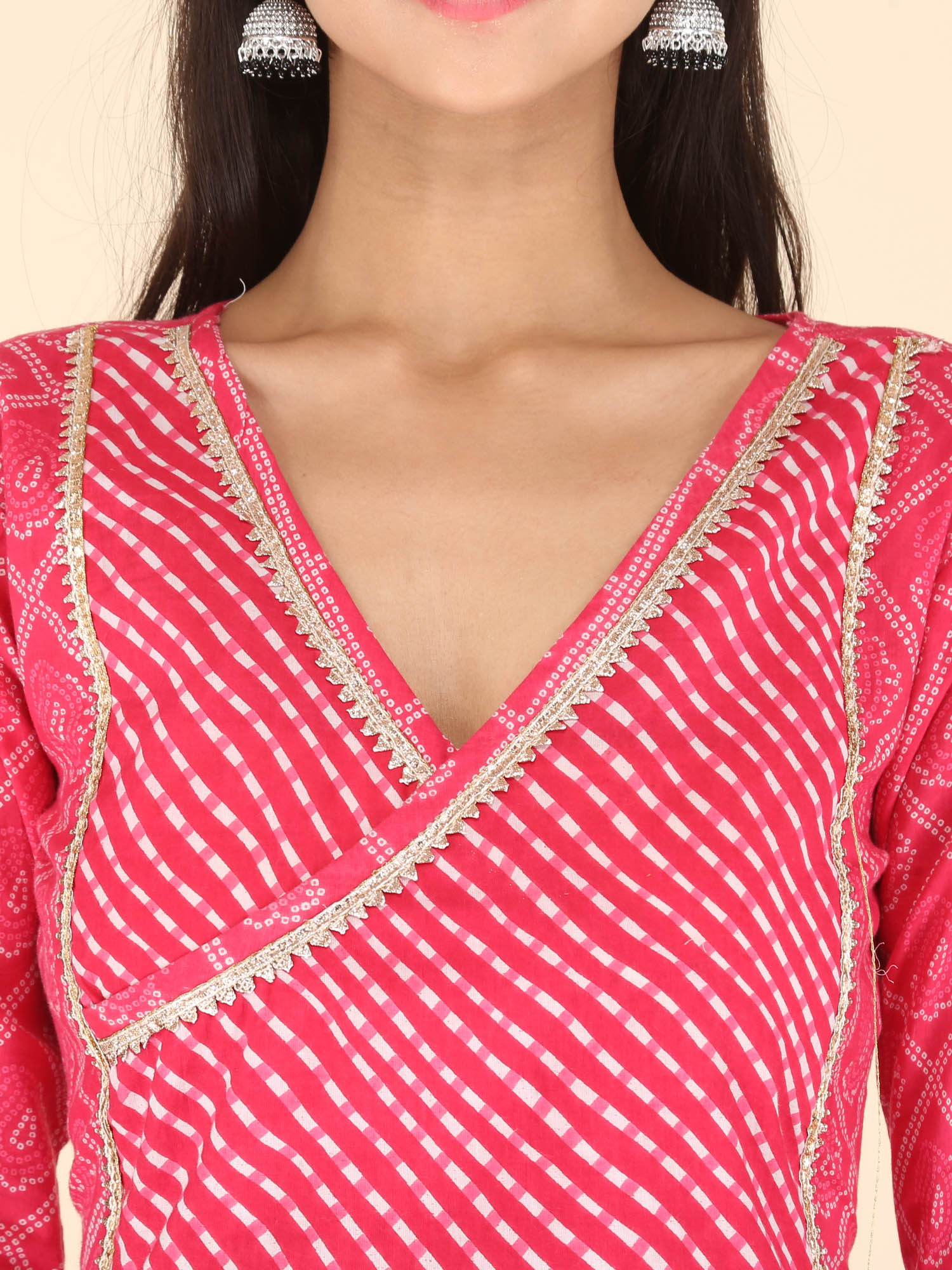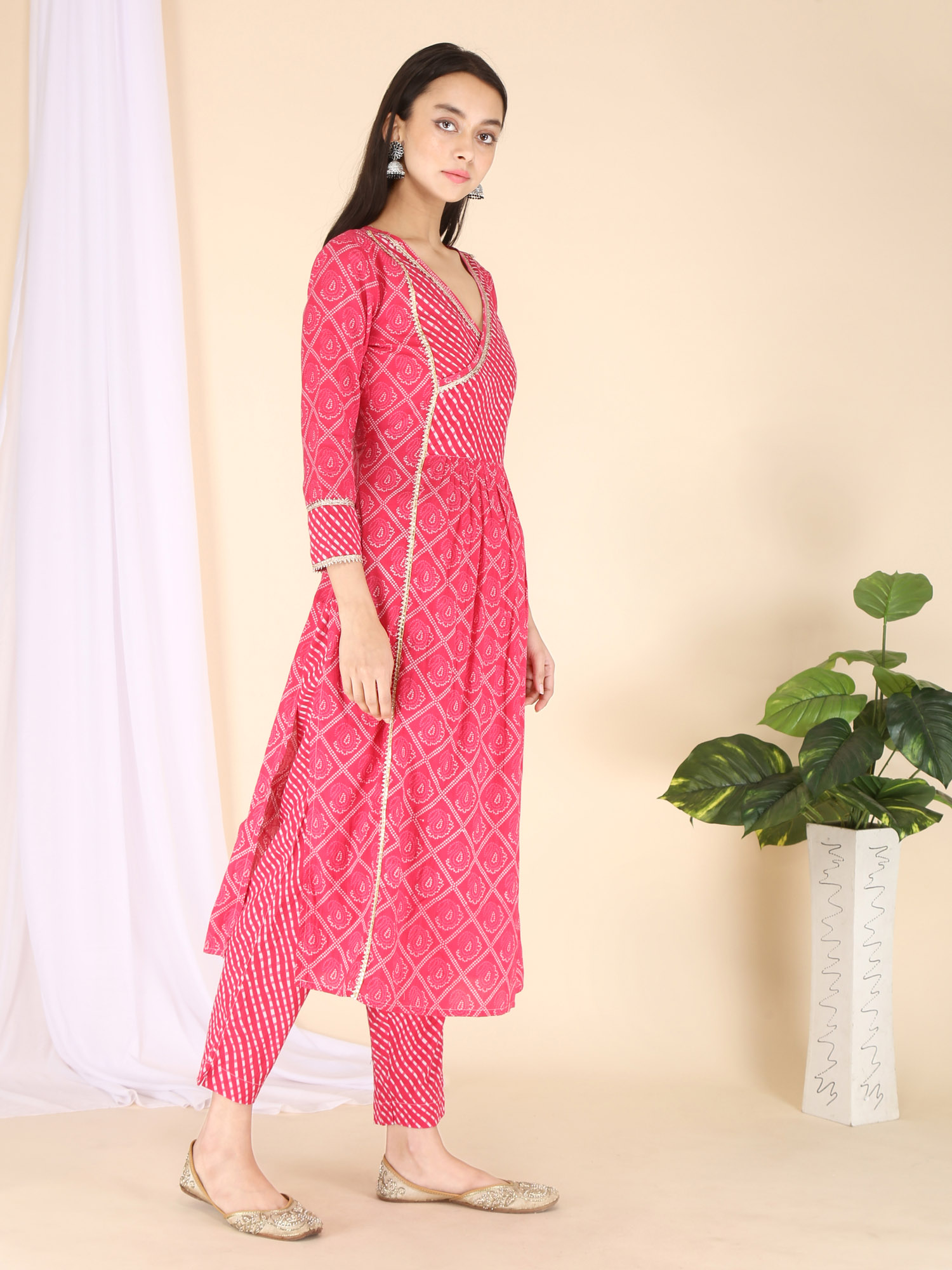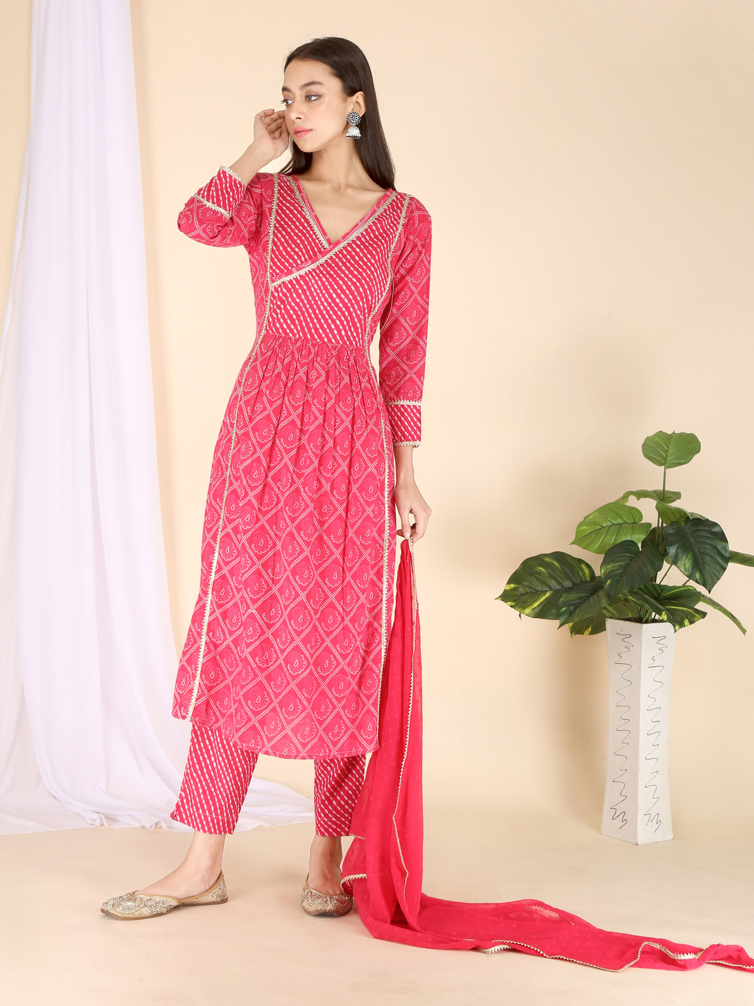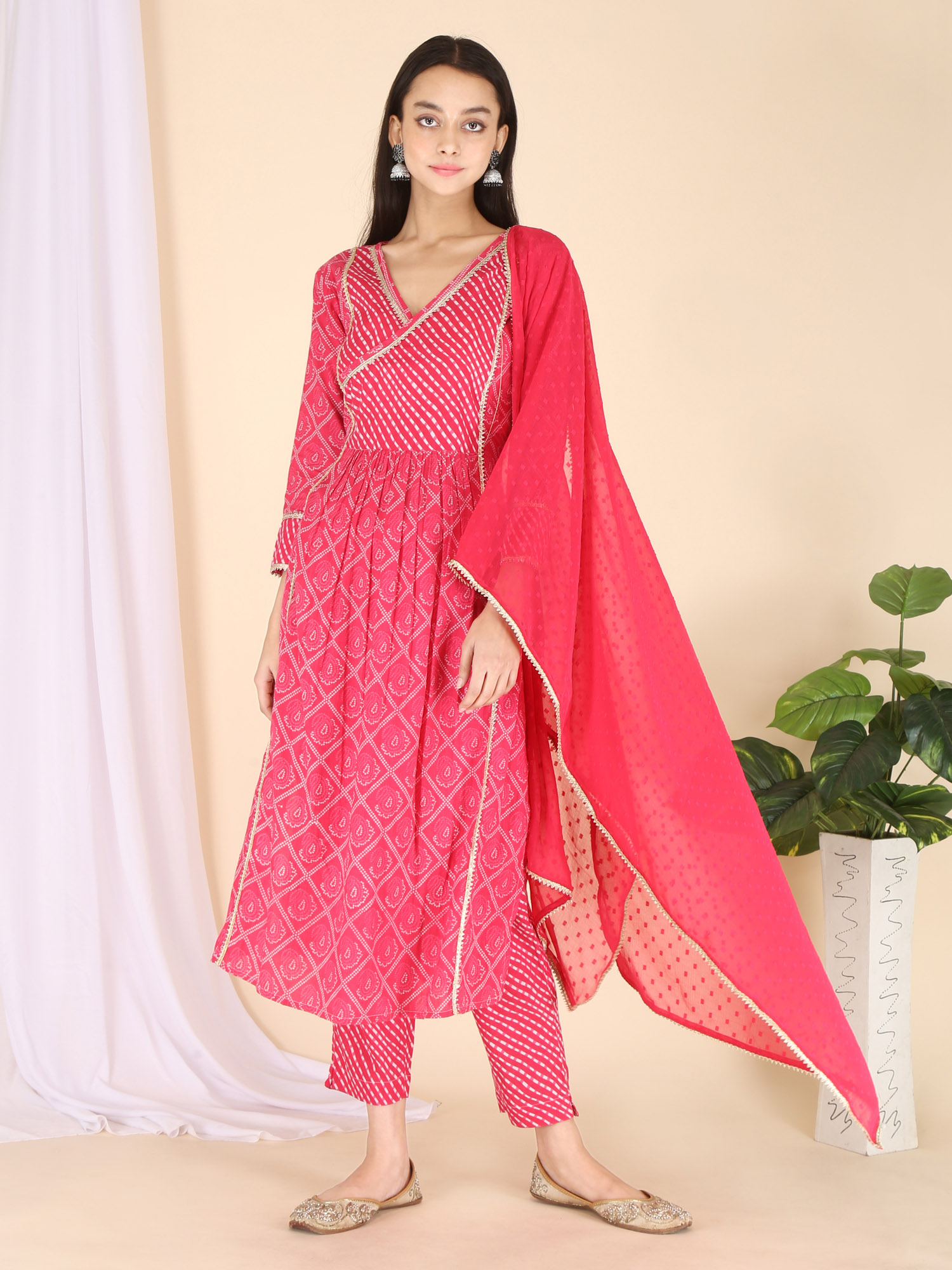 Festive pink bandhani printed kurta has a beautiful v-neck patched with leheriya print and fenced with Gota Lace. Pants are narrow and leheriya printed. Graceful kurta set is paired with chiffon dupatta fenced with gota lace. Wear it this festive season.