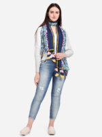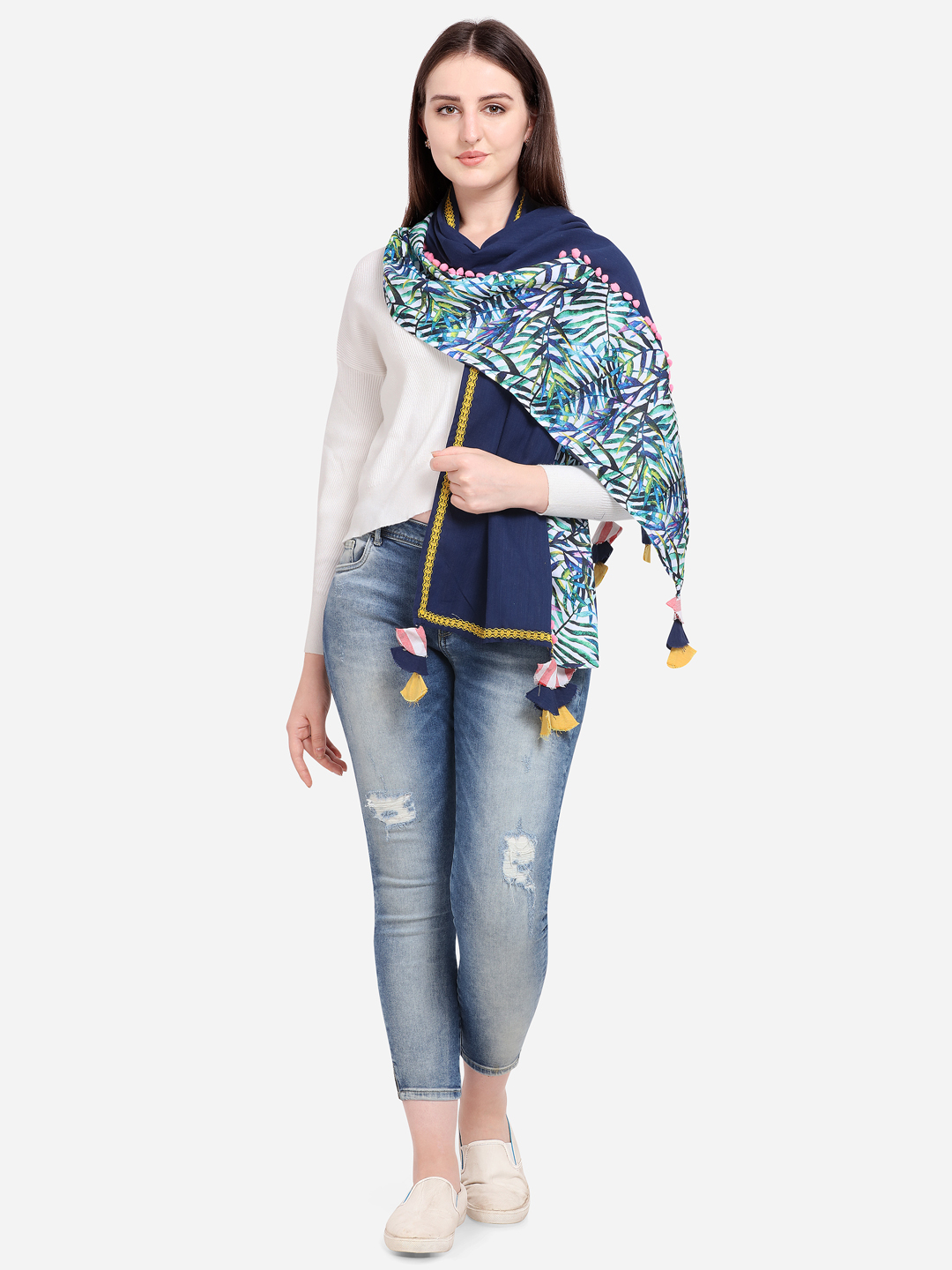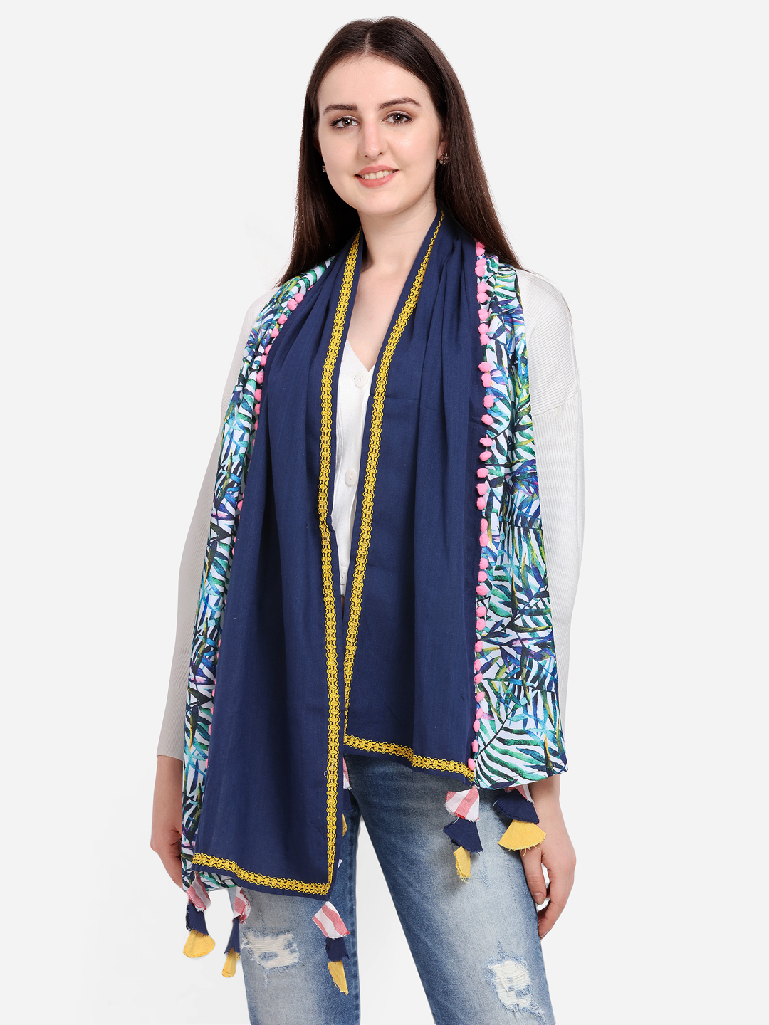 Navyblue half and half tropical hand picky casual stole/scarf has a tropical digital print on it. It is embellished with fancy lace and dyed pom pom lace. It has a conical two color fabric tassesls at its edges . The stole is Perfect for your casual outfit. its a multi seasonal stole can be wore in any season on any outfit. The khadi fabric gets softer after every wash this makes it special.