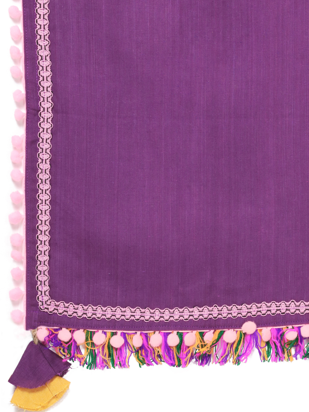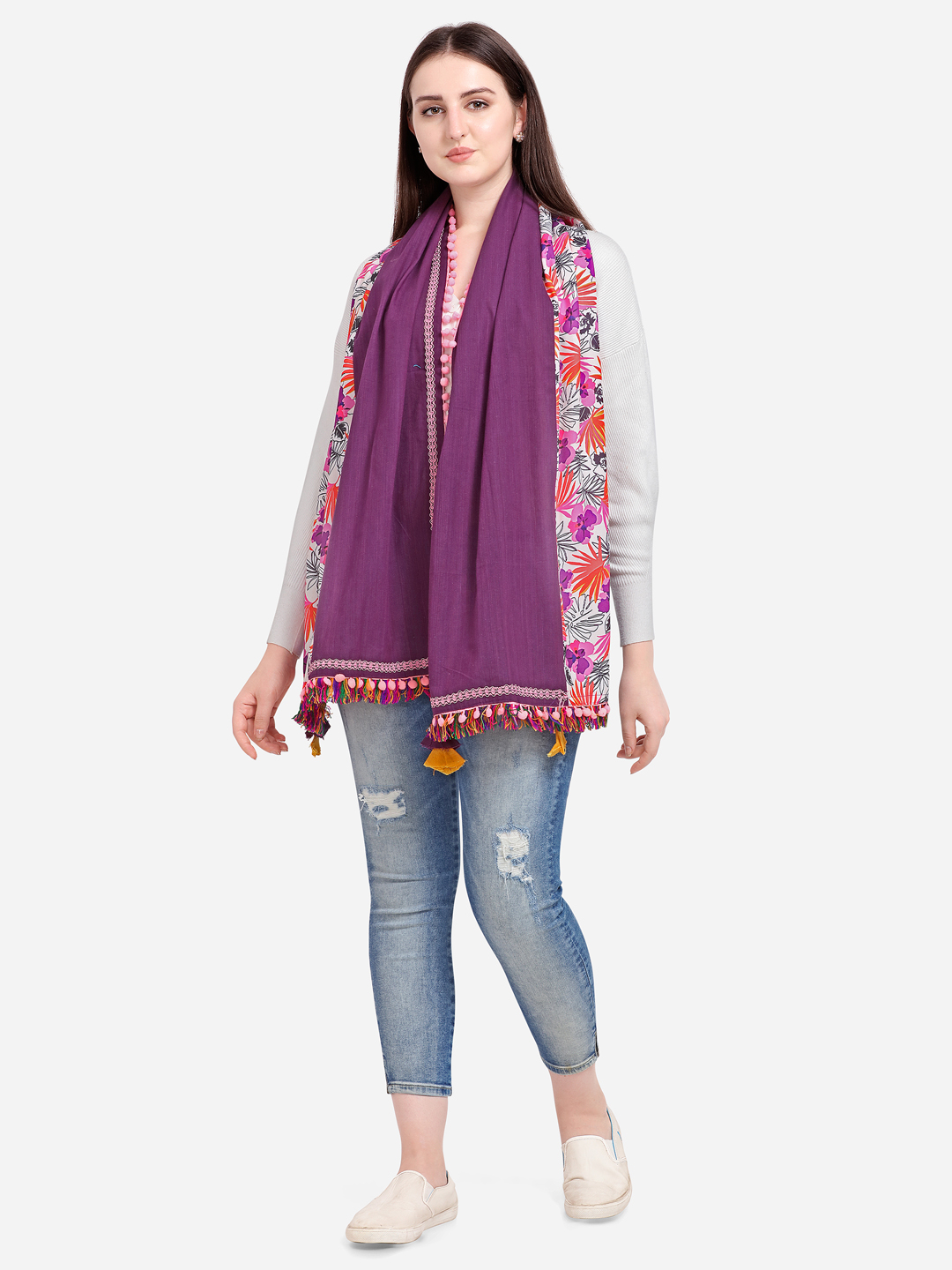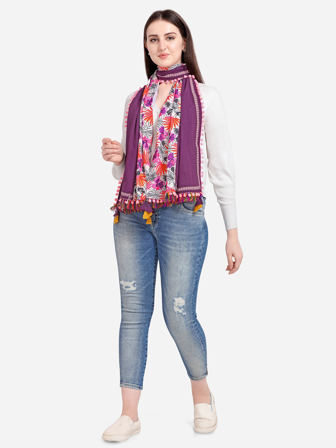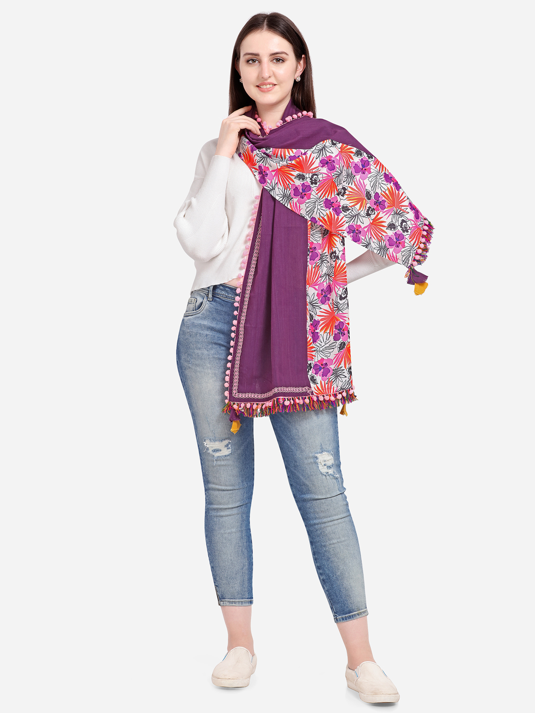 Purple half and half tropical hand picky casual stole/scarf has a tropical digital print on it. It is embellished with fancy lace and dyed pom pom lace. It has a conical two color fabric tassesls at its edges . The stole is Perfect for your casual outfit. its a multi seasonal stole can be wore in any season on any outfit. The khadi fabric gets softer after every wash this makes it special.