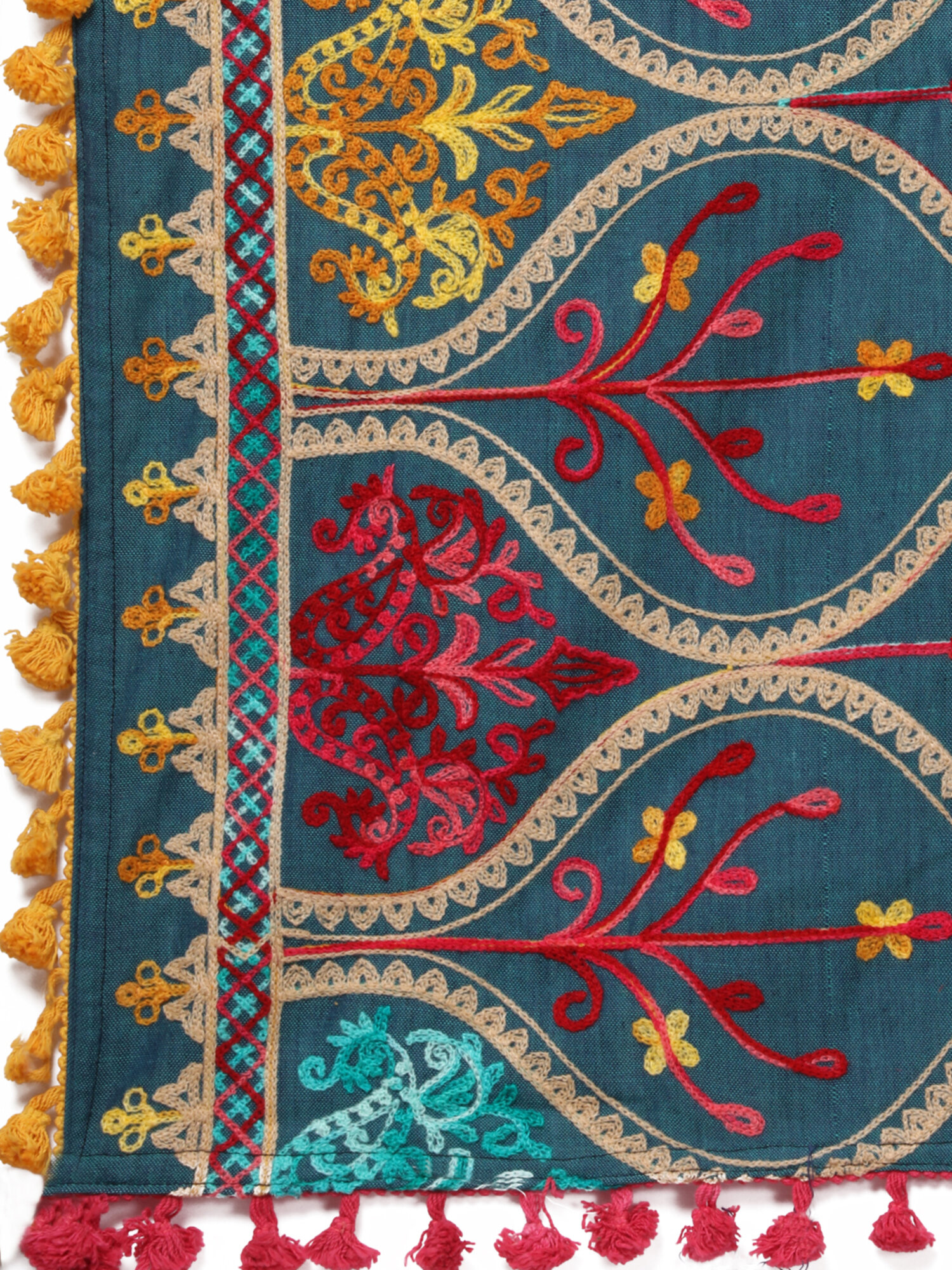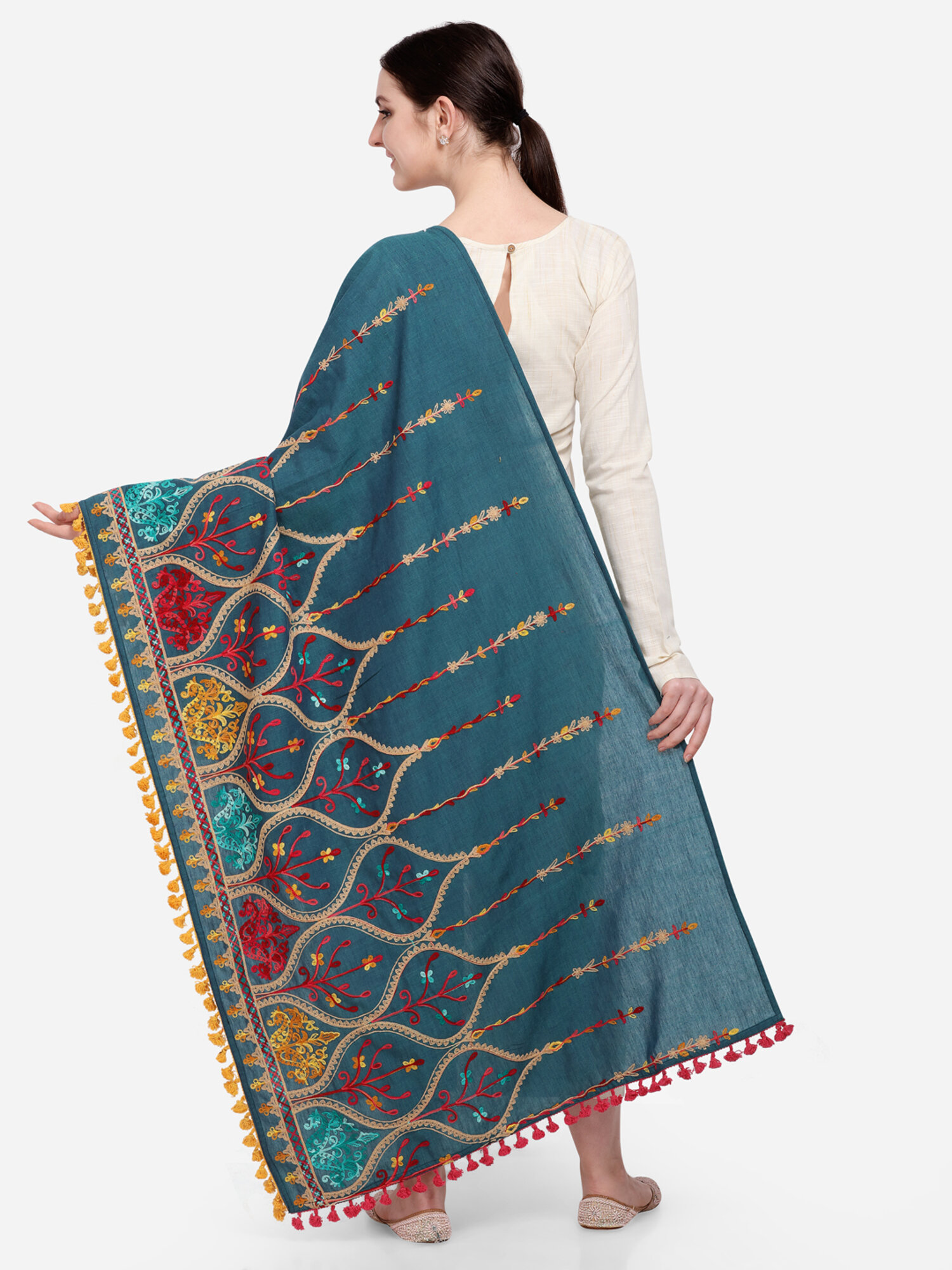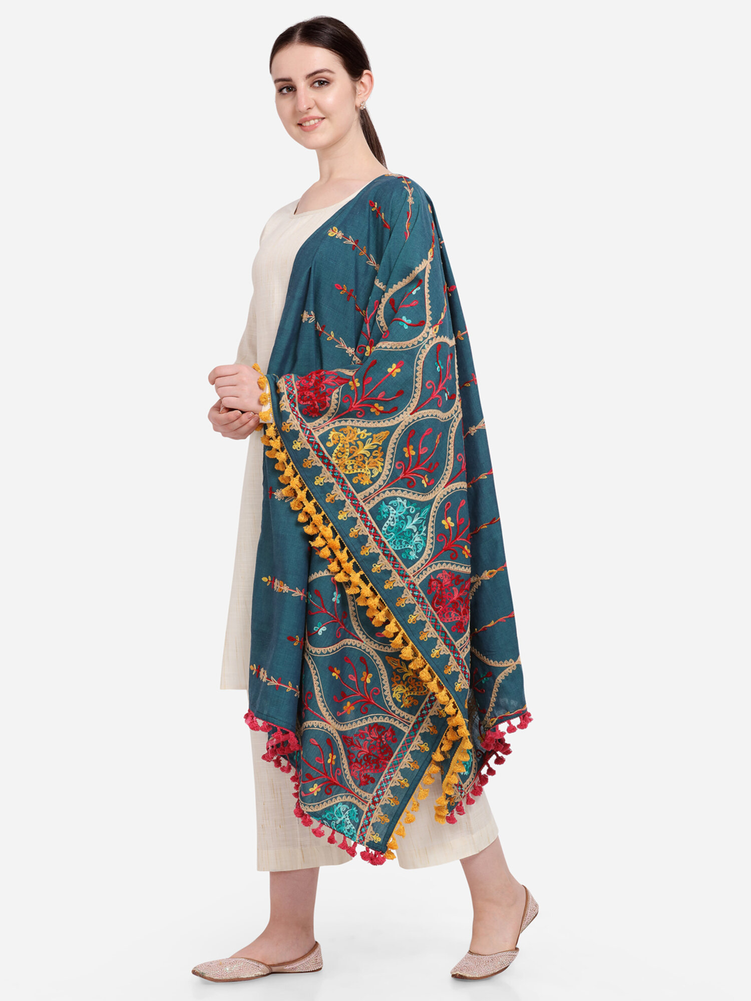 This turquoise shawl/dupatta is crafted in organic khadi cotton fabric. It is Heavily aari Embroidered with different kashmiri motif. It is fenced with wine dyed cotton tassel lace. For winters it is perfect as a fancy shawl and for festive it is perfect to carry on your fancy outifit.