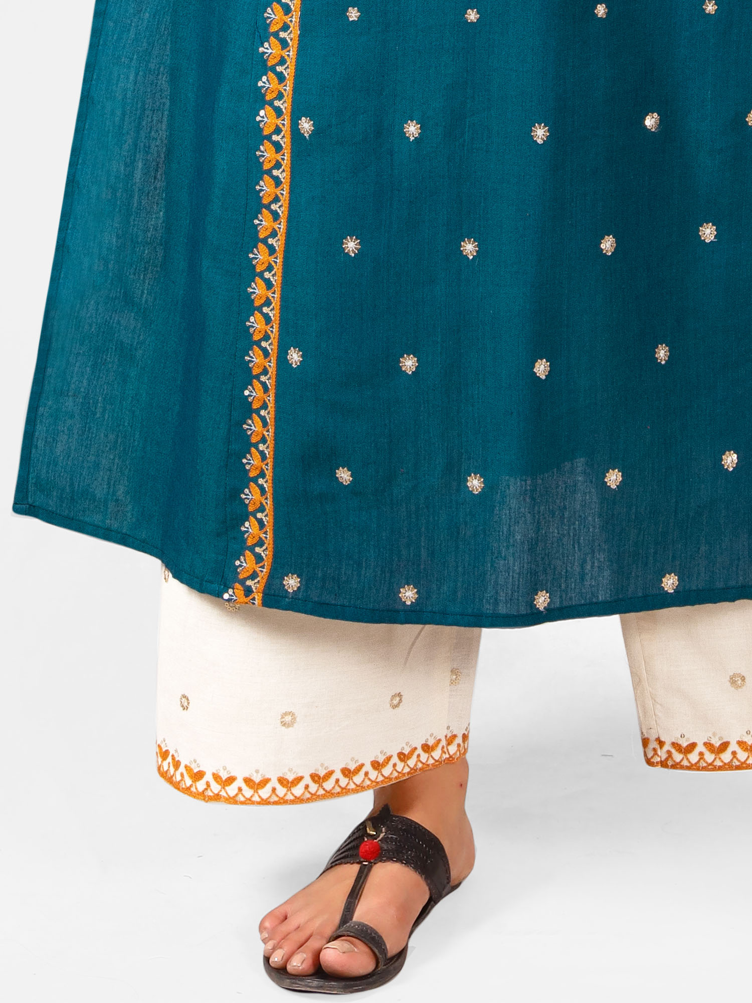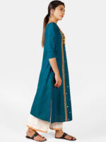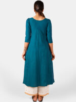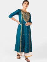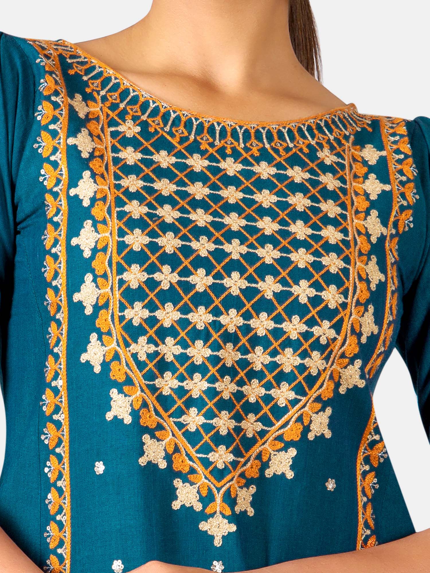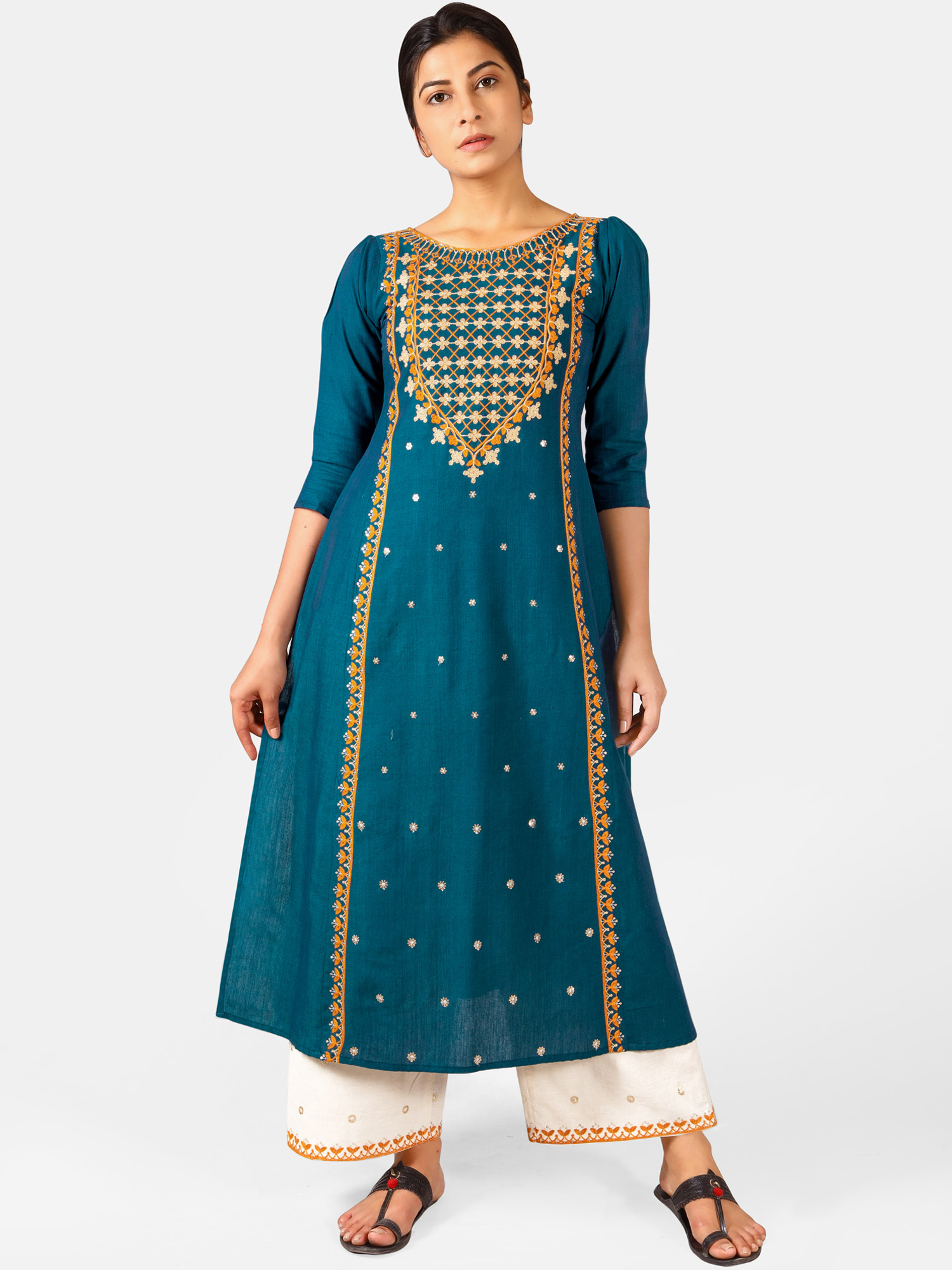 Turquoise two tone khadi cotton kurta embroidered with cotton zari thread in front panel with arri work , featured with boat neckline, puffy shoulder pleated 3/4 sleeves. It is decorated with twinkling sequence butti all over . The front minute embroidery maharani neck enhances its beauty . The fabric is very soft , comfortable, organic and skin friendly. The beautiful long kurta is paired with off white palazzo pant embroidered with sequence butti fenced with fancy border . A complete remarkable look for your Occassion .All the dresses will have armhole princes and are as per standard shoulder sizes and fit differs as per pattern (order one size bigger recommended)