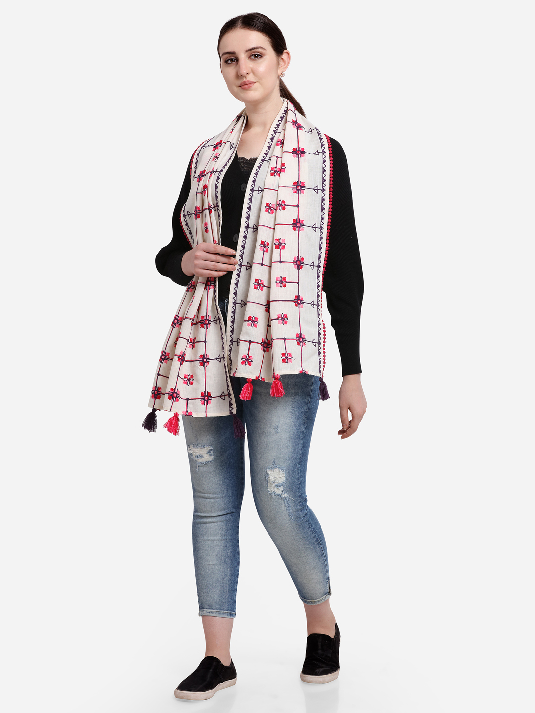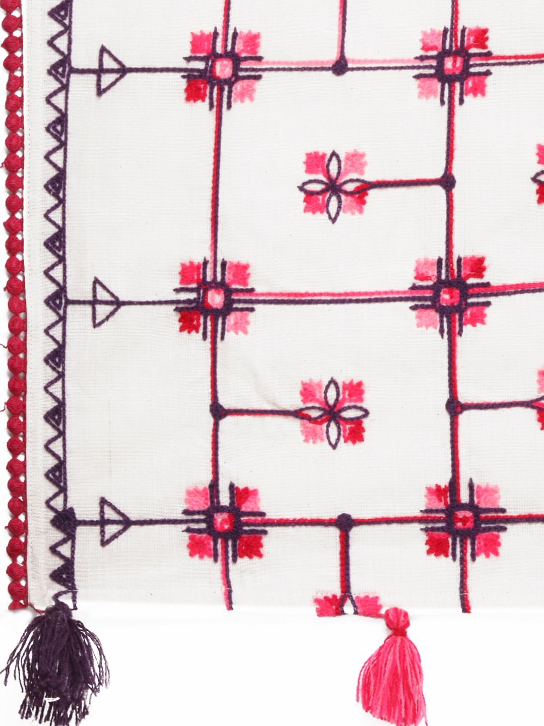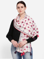 White hand pickey khadi cotton casual stole/scarf is embroidred with chain stich two color thread, it is fenced from one side by cotton dyed bundi lace