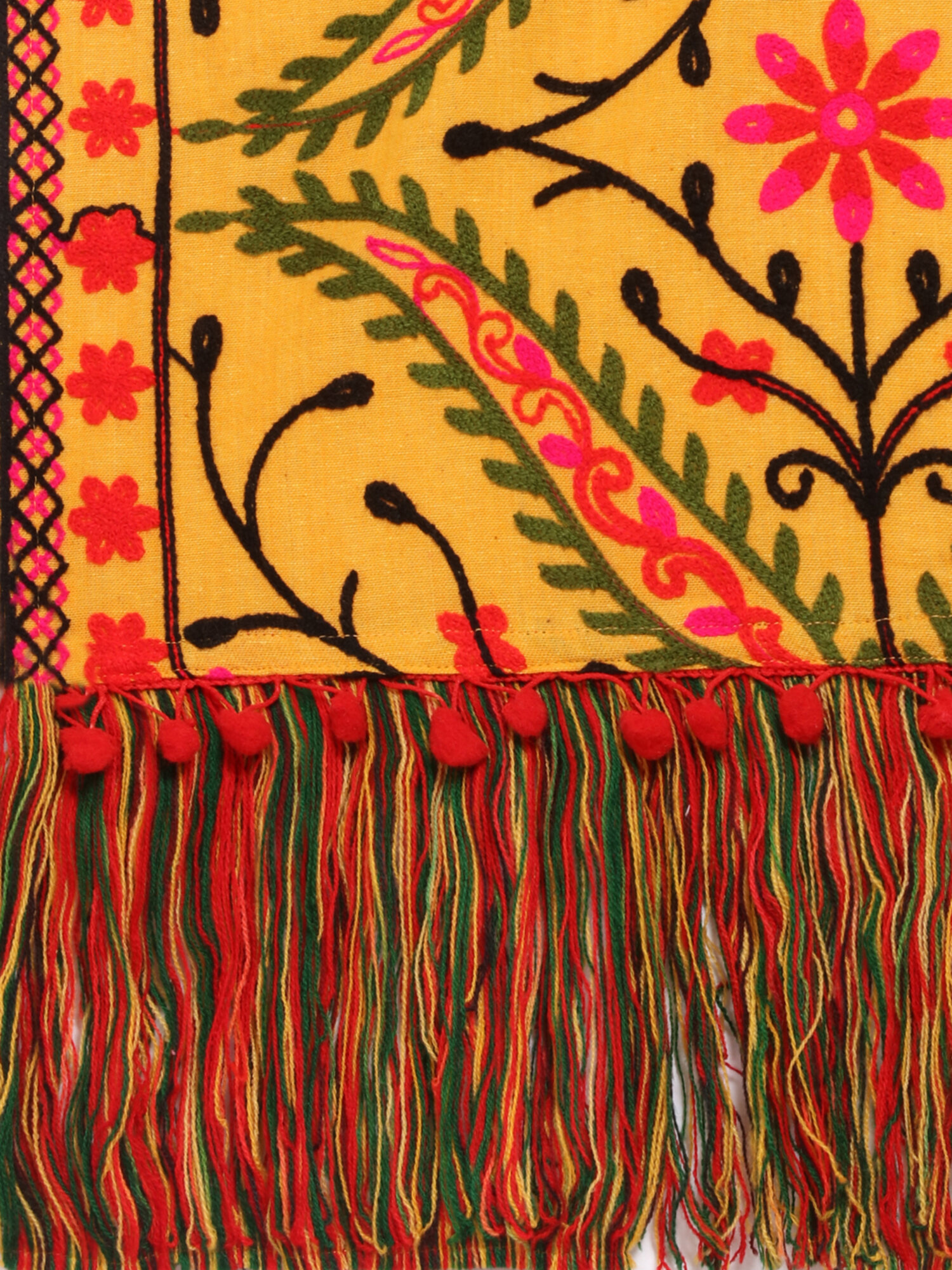 This muntard muffler is crafted in 100% khadi cotton fabric. It is fully embroidred with minute aari work in different fancy motifs with. It is embellished with fancy wollen long tassel lace and pom pom lace. The muffler is Perfect for your casual outfit. its a multi seasonal stole can be wore in any season on any outfit. The khadi fabric gets softer after every wash this makes it special.