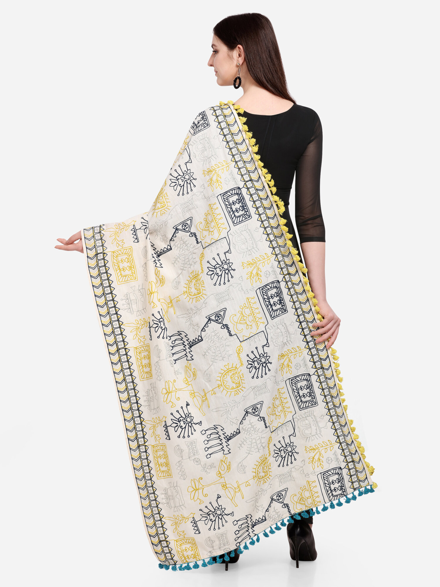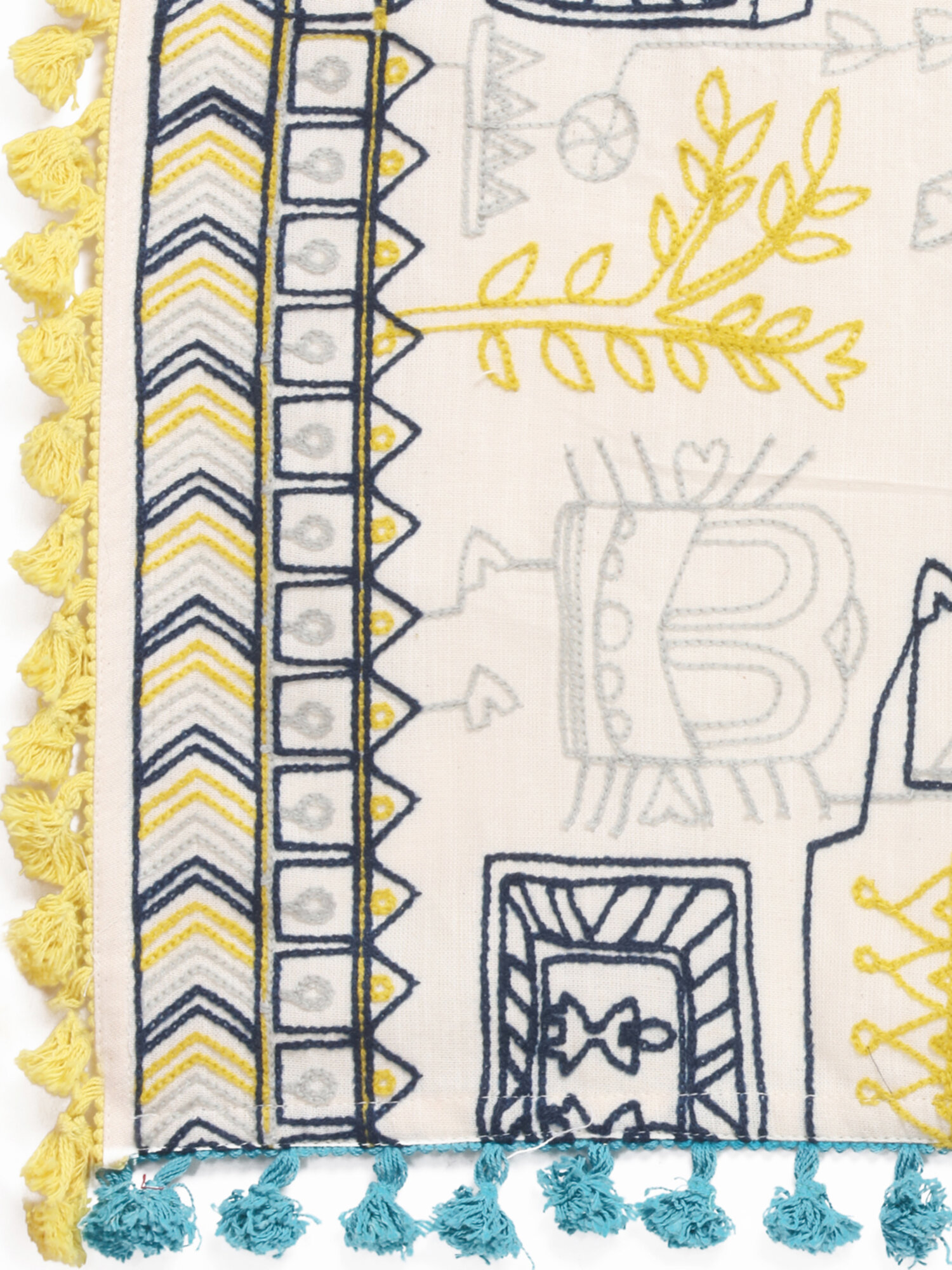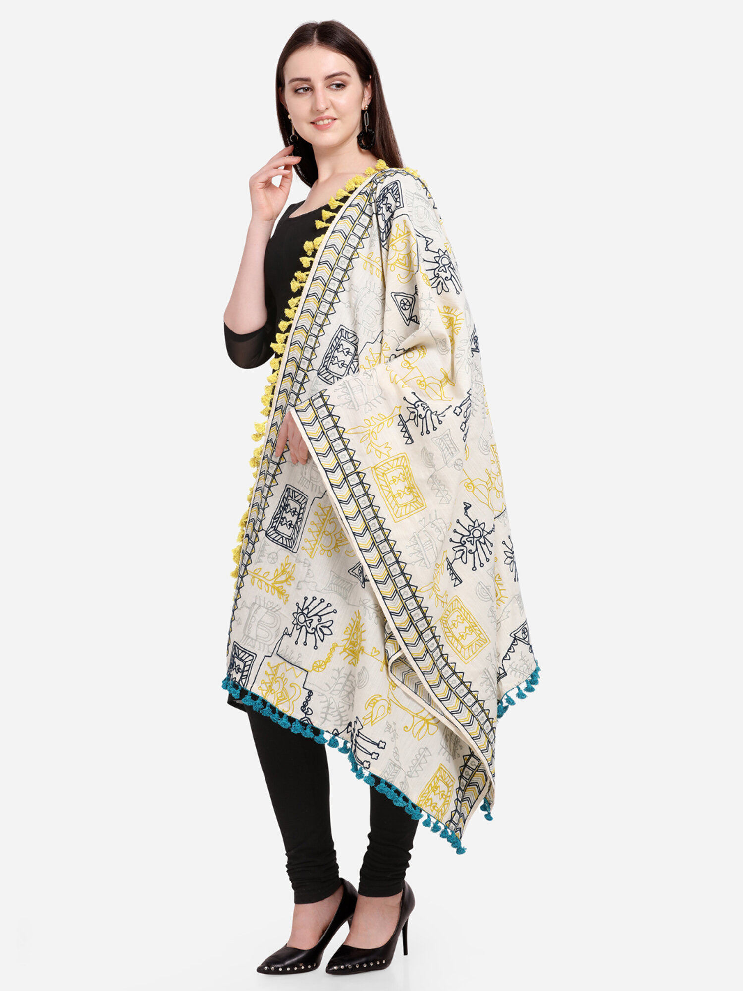 White Tribal Motif Aari Embroidered Khadi Shawl/Dupatta With Lemon Tassel Lace