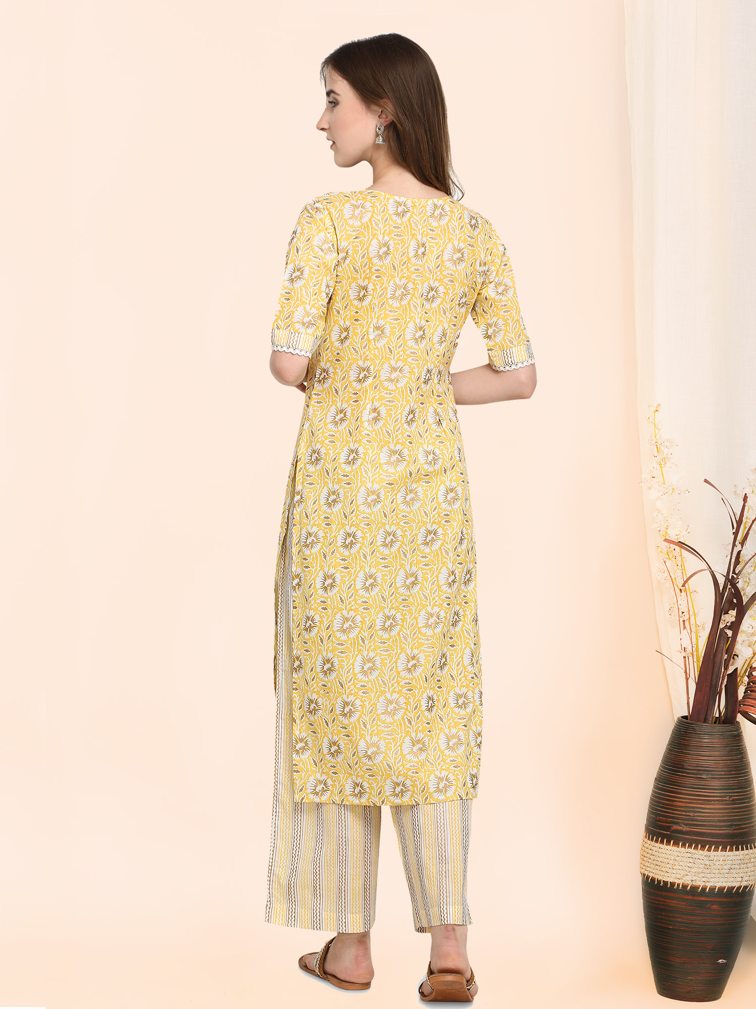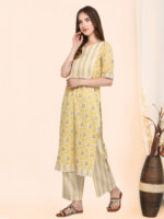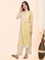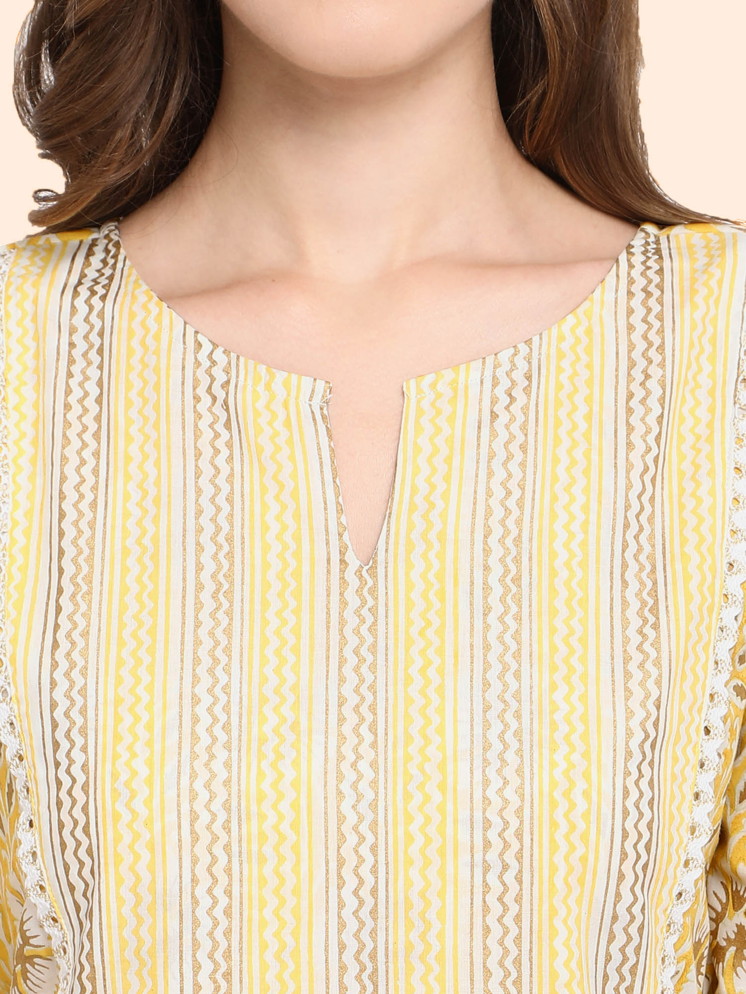Feel Fresh and elegant in this lively Lime colour. The kurta is hand block printed on the finest cotton and then foil printed. Cotton crochet lace is used for neckline and hem line. Paired with zig-zag Parallel bottoms